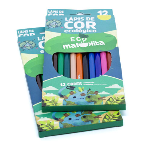 Nas embalagens, o protagonismo é das cores. Em vez de tratar o lápis de cor apenas como material escolar, Malukita se posiciona como convite à experimentação: cada caixa funciona como um pequeno “território de imaginação”, em que ilustrações, manchas de cor e formas orgânicas remetem a jogos, descobertas e à liberdade de criar sem medo de errar. A hierarquia de informações é simples e direta, para que o visual lúdico não comprometa a leitura, mas ajude a valorizar o produto nas prateleiras.